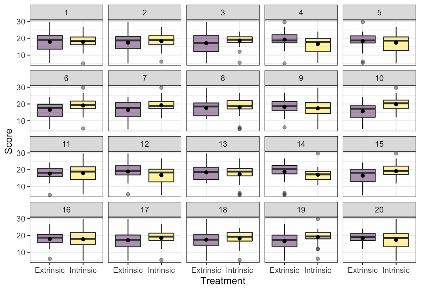 Most students recognize that side-by-side boxplots, faceted histograms, or density plots are reasonable choices to display the relevant aspects of the distribution of creative writing scores for each group. I then give them a lineup of side-by-side boxplots to evaluate (note I place a dot at the sample mean for each group), such as the one shown below. Here, the null plots are generated by permuting the treatment labels; thus, breaking any association present between the treatment and creativity scores. (I don’t give the students these details yet, I just tell them that one plot is the observed data while the other 19 agree with the null hypothesis.) I ask the students to