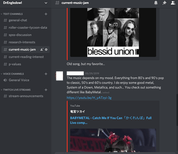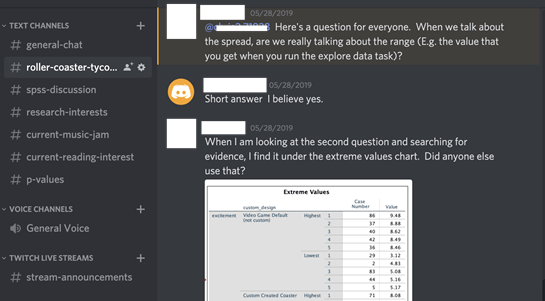 In the Advanced Statistics course, because the majority of students were teachers and administrators in K–12 schools, this course was managed largely asynchronously. I used Discord as the central place for managing the classroom environment. I regularly posted links to videos on my YouTube Channel and I also posted announcements for the few times I conducted livestreams using a free application called Twitch. Thus, Discord was used for nearly all student-student and student-instructor interaction. To encourage students to get to know one another more, and make discussions feel more authentic, I set up a #general chat channel for them to discuss anything they wanted to, where I would not be monitoring unless I was tagged. I also created a #current-music-jam and #current-reading-interest channel. Many students made use of these channels at different points, and I also shared my own reading and music interests.