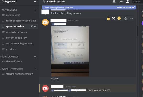 The course-specific channels I created to align with course learning goals were #roller-coaster-tycoon (to discuss assignments related to this dataset), #spss-discussion, #research-interests, and #p-values. Channels are very easy to add at a moment’s notice, but these seem to have sufficed for the course and were meant to work toward the GAISE recommendations to “foster active learning” and to “use technology to explore concepts and analyze data” (p. 3). It also supported students as we worked toward the GAISE goals regarding the investigative process, understanding statistical models, and understanding inference (p. 6). Discord supported these goals by providing a space where students could engage in productive discourse with one another to deepen their knowledge. For instance, as can be seen in the two screenshots below, students frequently inserted screenshots of output they were trying to make sense of in order to crowd source whether their interpretations were correct. I largely stayed out of these conversations, and found that many students would enter into the conversations, resulting in dialogic interactions that everyone learned from. Sometimes these conversations would head in an unproductive direction, but because I could see the entire conversation—unlike if it was occurring outside of class or in a group discussion in a face-to-face class where it might be difficult to hear what occurred—I could point directly back to the conversation using tagging—or even just tagging @everyone—or a screenshot and help steer students in a productive direction. This cannot be overstated: Being able to see entire conversations in this way is an incredible advantage over face-to-face discussions. It allows, in a sense, an omniscient perspective—one that everyone in the entire class also enjoys the benefits of.