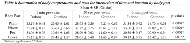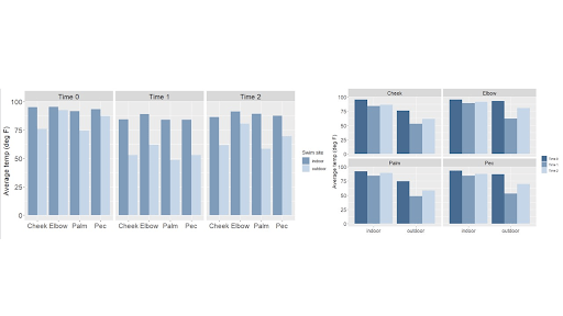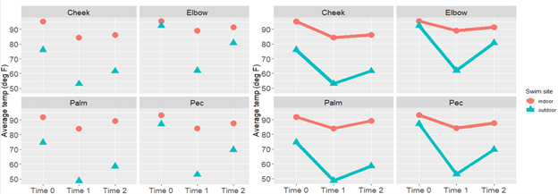 It was late October in Minnesota, a perfect time for a swim in a local lake! At least, so thought a biology professor at our university (I’ll call him Dr. Doe). This chilly excursion dislodged an idea in his mind: what is the relationship between the body temperature recovery at different areas of the body and water temperature? Dr. Doe collected data from six hard-core swimmers and asked me if my students in the statistical consulting class could help him answer his question “Sure”, I said.