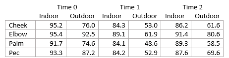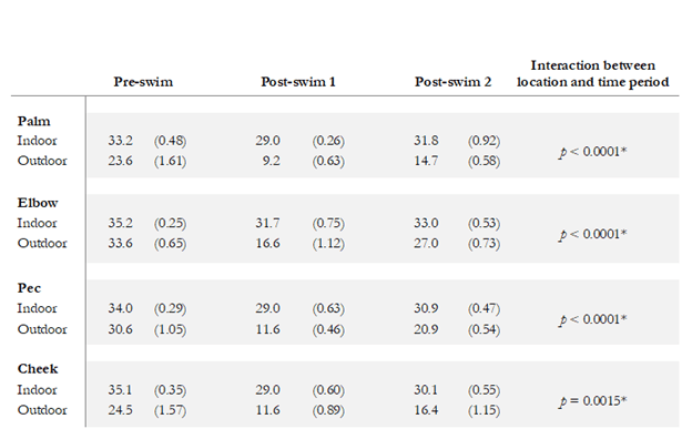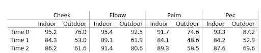 The above table is a depiction of the spreadsheet provided by Dr. Doe. These data are average body temperatures (in degrees Fahrenheit) from six hard-core swimmers measured at four different body parts, in two different swimming locations, across three time points (Time 0 = 1 minute pre-swim, Time 1 = 30 seconds and Time 2 = 5 minutes post-swim). The indoor water temperature was 79°F while the outdoor water temperature was a toasty 52°F.