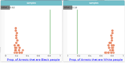 A CODAP sampler4 or other types of similar applications can simulate sample proportions of White and Black individuals arrested in specific counties. The dots here (see Figure 2) represent the expected proportion of each race that would be arrested based on random samples of individuals if each race was equally likely to be arrested. For each race group, the green line represents the actual proportion of arrests in the county (i.e. 82% of all marijuana arrests in our county were of Black individuals). Students can clearly see that the green line is very unlikely to happen due to chance. This example is referred to again when the concept of p-values is discussed in hypothesis testing.