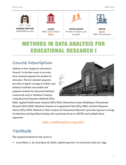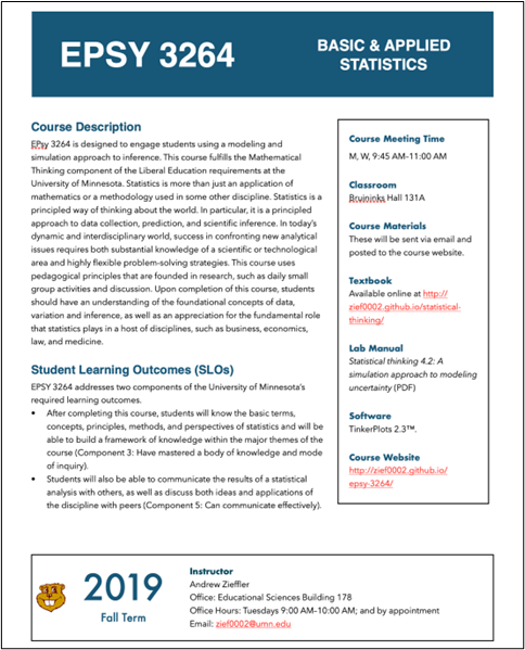 I wanted to set the tone immediately by welcoming students to the course. I also wanted to give them a broad overview (via the course description) about what they will be encountering. In considering the student point-of-view, I wanted basic course information easily accessible (location of the classroom, materials needed, etc.). As such, this is included on the landing page of the course website. I also wanted details about statistical computing and a “Note on Inclusion and Respect”, key aspects of the course, to appear early in the syllabus given their prominence.